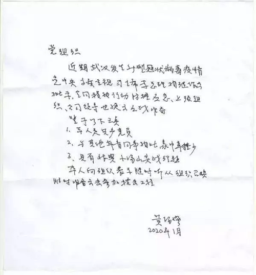 已經79歲的黃錫璆第一時間向組織遞交了請戰書。他寫道:“本人是共產黨員,與其他年青同事相比家中牽掛少,具有非典小湯山實戰經驗。本人向組織表示,隨時聽從組織召喚,隨時準備突擊參加抗擊工作。”
