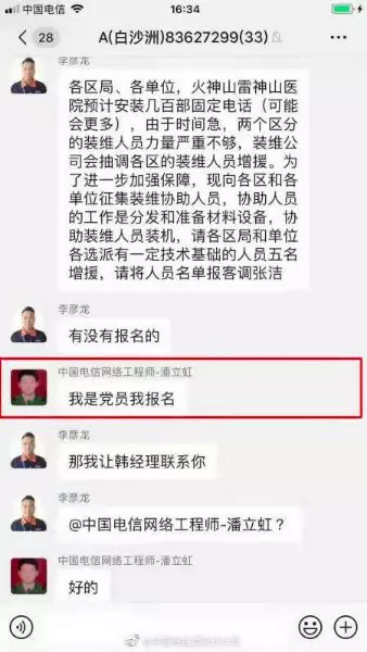 為了保障醫院固定電話的正常運維,武漢電信計劃從各區抽調人員,增強前線保障力量。通知剛剛發出,武昌區分裝維員工潘立虹立即響應。“我是黨員我報名!”