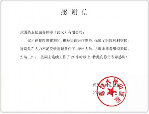 武漢火神山醫(yī)院亦對于國藥衛(wèi)勤志愿者團(tuán)隊(duì)表達(dá)了感謝!