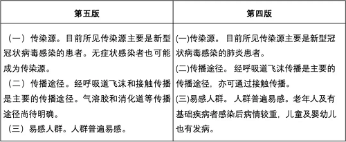 在第四版的基礎上,第五版修改了傳染源,進一步明確無癥狀感染者也可能成為傳染源。傳播途徑更新為經呼吸道飛沫和接觸傳播是主要的傳播途徑,氣溶膠和消化道等傳播途徑尚待明確。易感人群覆蓋到人群普遍易感。