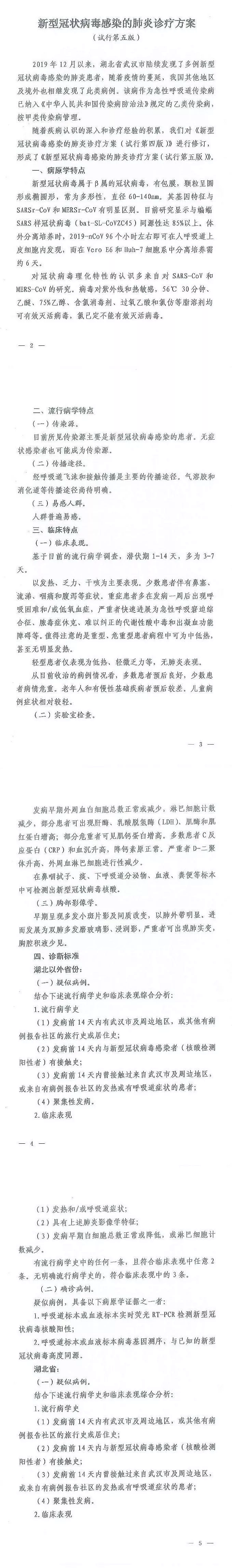 為應對新型冠狀病毒感染病患增加,以及危重癥患者不斷增多的實際情況,2月2日下午相關部門召集權威專家開展聯席會議,在《第四版新型冠狀病毒感染的肺炎診療方案》的基礎上修訂了第五版試行方案(以下簡稱“第五版方案”)。