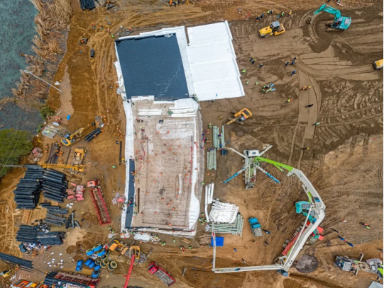 施工企業全部完成項目場地整平、碎石黃沙回填,管溝開挖持續進行。HDPE膜面積達3萬平方米,鋪貼面積已經過半,北區板房基礎混凝土澆筑完成。