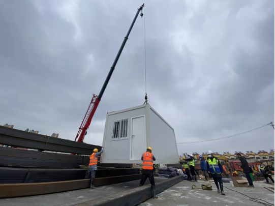 上午11時箱式板房首個模塊開始吊裝。現場進度快速推進,首次使用的裝配式醫療病房是新型可周轉材料,拼裝速度快,保溫隔熱效果好。