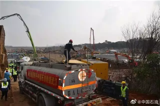 上午10點,兩輛載滿16噸柴油的中國石油油罐車,駛入火神山醫院工地現場,為緊張施工的各類車輛、發電機、工程器械快速加注油品,保障施工過程緊湊高效持續。