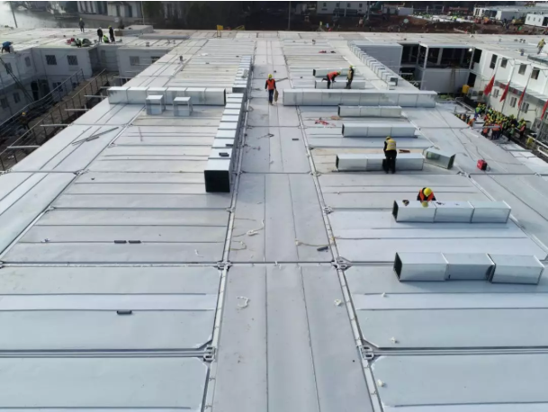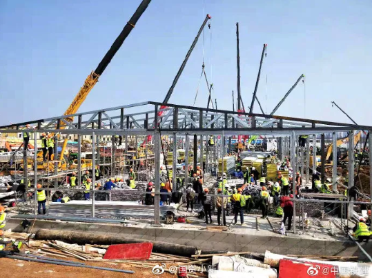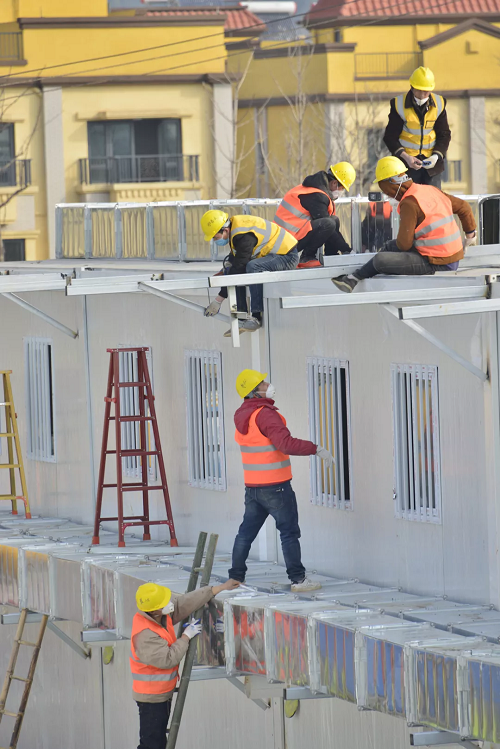 下午16時,中建三局等全部完成現場場地平整和回填,板房基礎混凝土澆筑完成約90%,完成300多個箱式板房骨架安裝,同時場外抓緊板房拼裝,完成約400個,吊至現場直接安裝。水電暖通、機電設備等材料全面到位,同步開始作業。