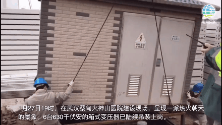 19時,火神山醫院建設現場,國家電網6臺630千伏安的箱式變壓器已陸續吊裝上崗。