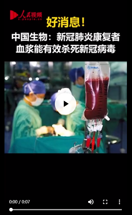 中國生物稱,在目前缺乏疫苗和特效藥的前提下,新冠肺炎康復者恢復期的血漿是臨床特異性治療最可及的資源。