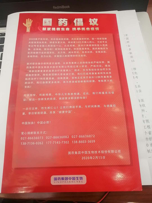 國藥中生2月15日發出倡議書,倡議新冠肺炎康復者捐獻血漿,捐獻條件包括“新冠肺炎康復者年齡在18-60周歲,確診感染過新型冠狀病毒,出院后目前身體狀況較好,沒有其他不適,并愿意捐獻出自己的血漿幫助他人”等內容。
