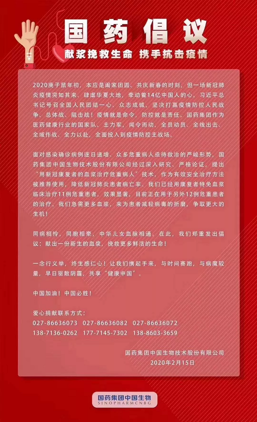疫情發生以來,國藥中國生物迅速反應,已開展治療性血漿、抗新型冠狀病毒免疫球蛋白、新型冠狀病毒滅活疫苗、重組基因工程疫苗、單克隆抗體等科研攻關工作。