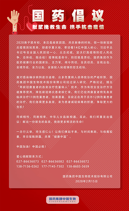 為了挽救更多鮮活生命,為患者爭(zhēng)取更大的生機(jī),國藥集團(tuán)中國生物向新冠肺炎康復(fù)者鄭重發(fā)出倡議:
