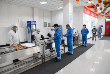 新華社照片,烏魯木齊,2020年2月22日 新疆烏魯木齊:防疫不松勁 復工干勁足 2月22日,在新疆海螺型材有限責任公司職工食堂,工作人員排隊打飯。 連日來,新疆烏魯木齊部分企業在確保做好防疫工作的前提下,安全有序復工,復工企業主要以電力、熱力、食品、化工企業等急需物資重點企業以及生活保障企業為主。 新華社記者 丁磊 攝
