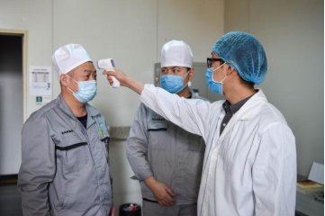 新華社照片,烏魯木齊,2020年2月22日 新疆烏魯木齊:防疫不松勁 復工干勁足 2月22日,在國藥集團新疆制藥有限公司,工作人員在測量體溫。 連日來,新疆烏魯木齊部分企業在確保做好防疫工作的前提下,安全有序復工,復工企業主要以電力、熱力、食品、化工企業等急需物資重點企業以及生活保障企業為主。 新華社記者 丁磊 攝
