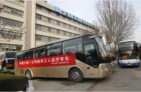 2月19日下午3時45分,濟南市首批6輛建筑工人返濟“點對點”專車駛出中建八局一公司院內,前往江蘇、河南,接回近200名農民工兄弟返回濟南投入生產。