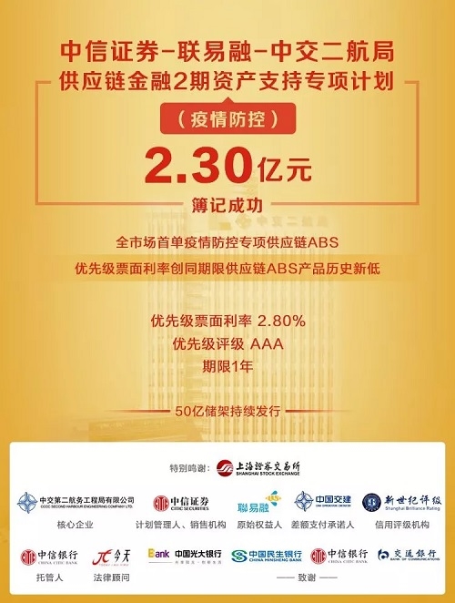 2月14日,中交集團所屬二航局在上交所簿記發行全市場首單疫情防控資產支持證券(ABS),發行規模2.3億元,期限1年,優先級票面利率2.8%,7天完成發行,發行效率創供應鏈金融ABS產品歷史新高。