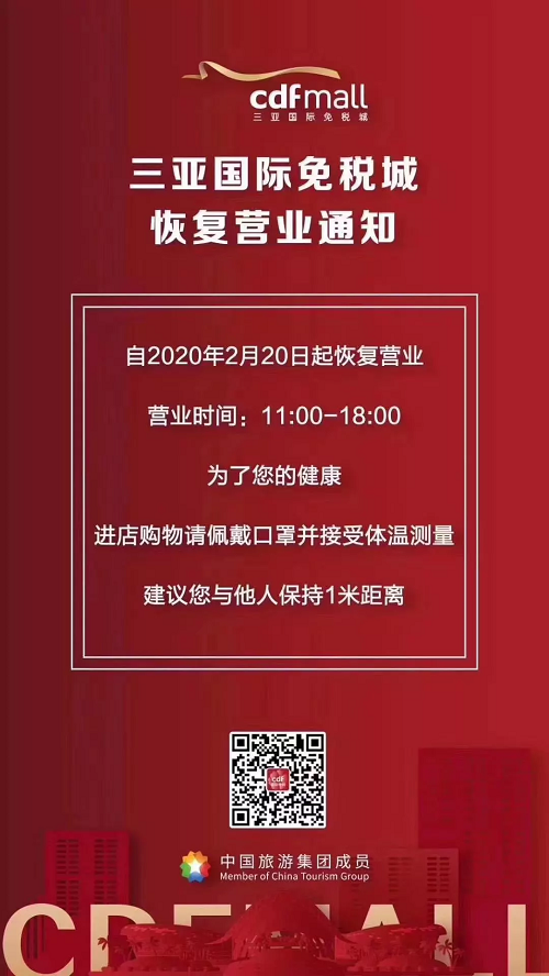 自2月20日起,中國旅游集團三亞國際免稅城一期及二期開始恢復營業,營業時間為11:00-18:00,全方位為顧客提供舒適、安心、安全的購物環境。