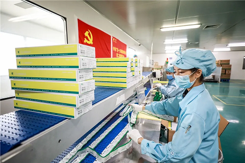 佩戴著口罩、穿著統一制服的工人們在生產線上作業,迅速地將已內包裝好的配方顆粒疊好放進外包裝盒里,并在包裝盒上貼上相應的產品標簽。這些產品經過檢驗后即可供應市場。