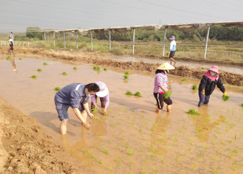 南方電網海南電網公司派駐的“80后”駐村第一書記、白沙黎族自治縣榮邦鄉光村鄉村振興工作隊隊長劉志鵬(左一)和村民熱火朝天地忙著水稻插秧。