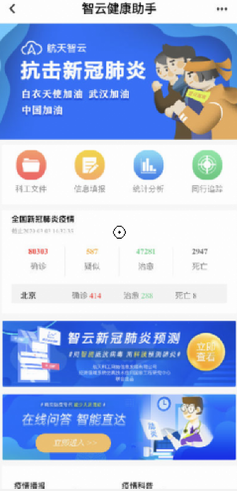 中國航天科工二院網信公司發揮大數據及人工智能技術優勢,開發智云健康助手,為復工復產提供信息捕獲、數據支撐、輔助決策和態勢監控等技術支撐,AI+數據,云上助力疫情防控和應急管理。智云健康助手通過二維碼掃描填報,頁面簡潔、操作便捷,具備疫情信息查詢、疫情信息填報、醫療服務對接、政策文件共享等功能,其中疫情信息填報可實現“出行記錄、健康日報、體溫監控、隔離情況”等常用信息一鍵提交、自動統計。后臺數據實時智能分析、可視化展示,加強了對企業復工復產期間的趨勢分析和疫情預警,讓數據的變化實時顯示,快速精準“阻擊”疫情蔓延,為抗擊疫情、復工復產提供智能分析。目前,智云健康助手已在北京市豐臺區委區政府等政府機構,二院、湖南航天等多家單位推廣應用。