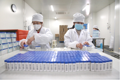 Employees pack medicines at a production facility in Meishan, Sichuan province, on Feb 10. [Photo by Zhang Zhongping/For China Daily]