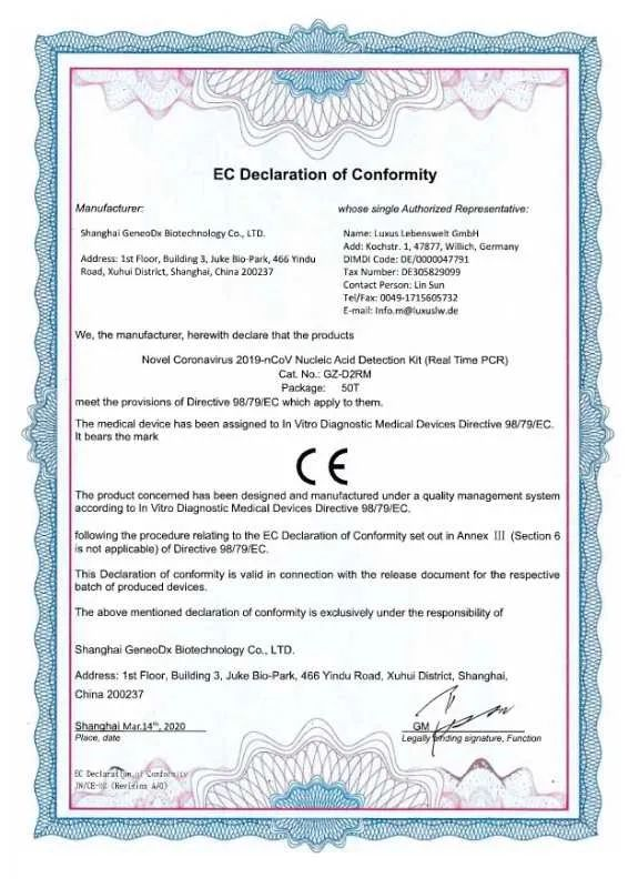 3月14日,國(guó)藥中國(guó)生物上海捷諾完成了自主研發(fā)的新型冠狀病毒2019-nCoV核酸檢測(cè)試劑盒(熒光PCR法)的歐盟CE認(rèn)證。歐盟CE認(rèn)證表明該產(chǎn)品符合歐盟醫(yī)療器械相關(guān)指令的符合性要求,具備歐盟市場(chǎng)的準(zhǔn)入條件。