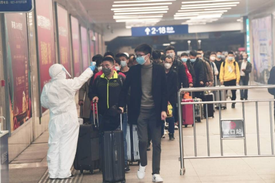 漢口站的站前廣場上,停著36臺點對點接送大巴,40多位志愿者專門來到現(xiàn)場服務,測體溫、消毒后有序上車。1013名員工被大巴點對點地送往工廠或居住的小區(qū)。
