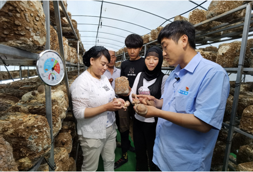 中建二局甘肅省康樂縣何家溝村駐村書記牛軍帥在香菇大棚內結對培訓。