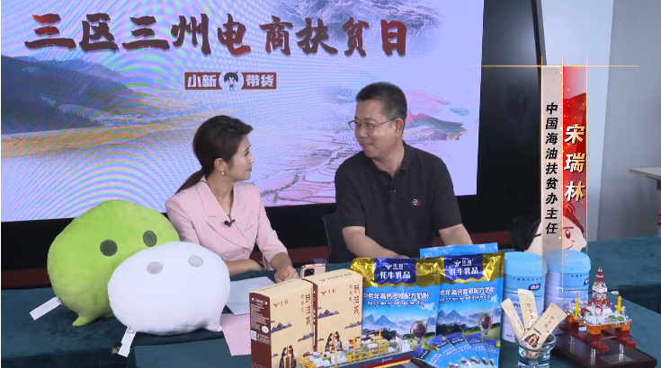 ▲中國海油扶貧辦主任宋瑞林,為甘南合作市牦牛乳酥油茶等特產(chǎn)帶貨。