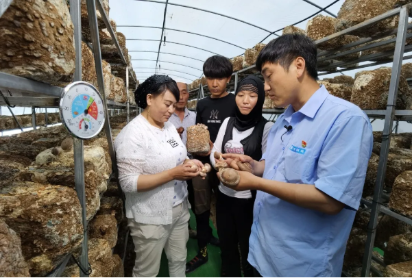 ▲中建二局甘肅省臨夏州康樂縣何溝村駐村書記牛軍帥,在香菇大棚內(nèi)結(jié)對培訓(xùn)。