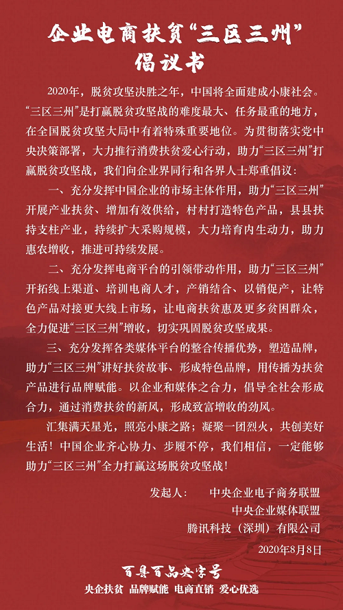 為貫徹落實黨中央決策部署,大力推行消費扶貧愛心行動,助力“三區三州”打贏脫貧攻堅戰,在8月8日“三區三州電商扶貧日”,中央企業電子商務媒體聯盟、中央企業媒體聯盟、騰訊科技(深圳)有限公司聯合向企業界同行和各界人士發出《企業電商扶貧“三區三州”倡議書》——