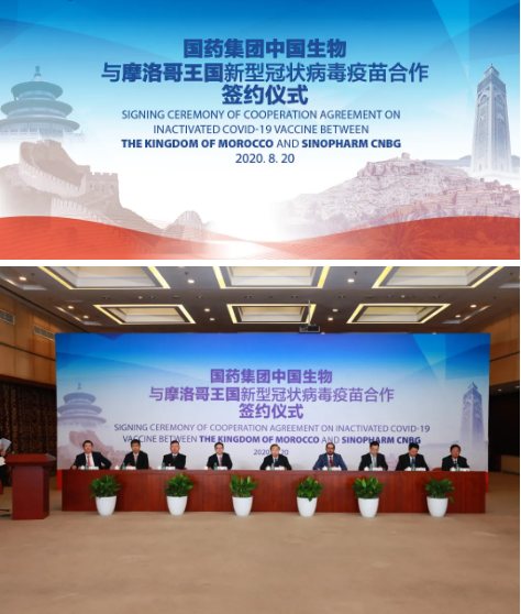 8月20日下午,國藥集團中國生物與摩洛哥王國新型冠狀病毒疫苗合作簽約儀式在北京、拉巴特兩地,以視頻會議方式同步舉行。這是繼獲得阿聯酋、秘魯臨床試驗批件后的又一重要進展,標志著國藥集團中國生物國際臨床試驗進程全面提速。雙方將通過團結合作戰勝疫情,為共同構建人類衛生健康共同體做出不懈努力。