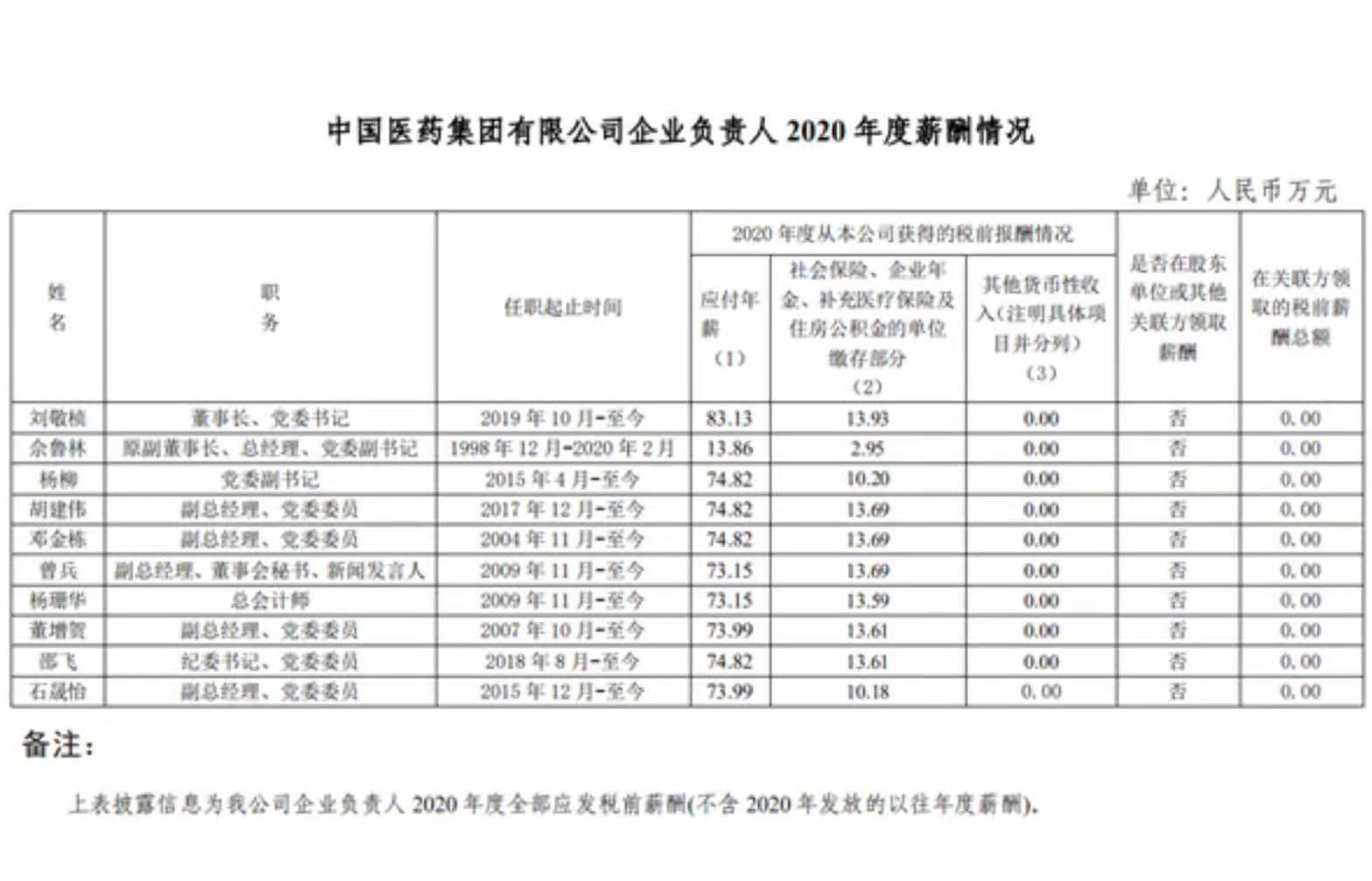 國藥集團企業負責人2020年度薪酬情況